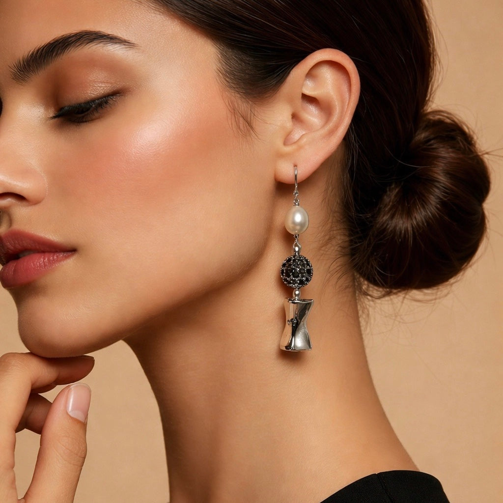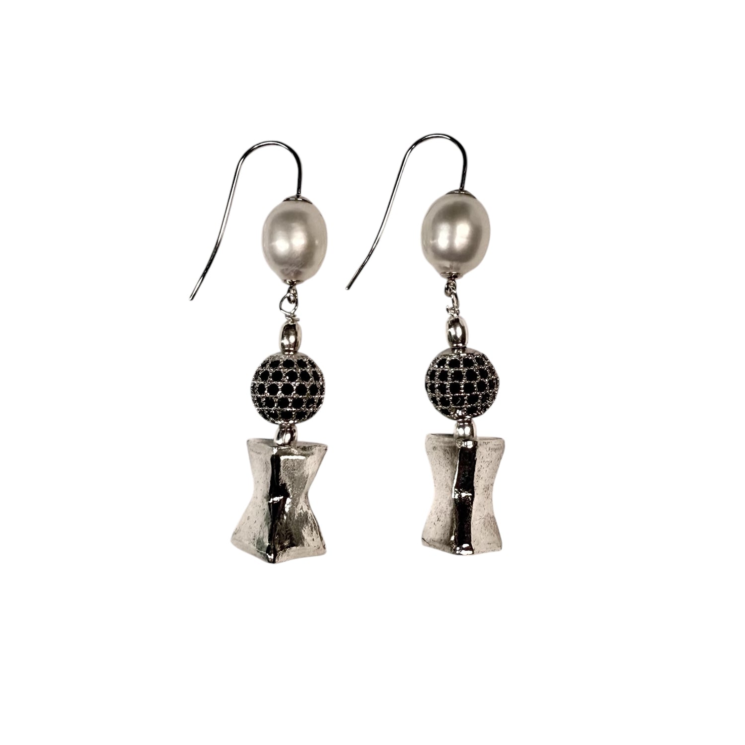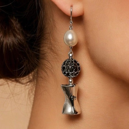 Orecchini pendenti, leggerissimi con perla, pallina con zirconi neri, e pezzo in argento.
